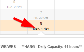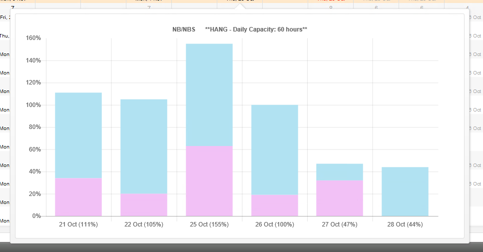 In the Above example NB/NBS & HANG ON, We can see the Branch has a Capacity of 60 Hours and on the 21 Oct, they are booked to 111% of their capacity.