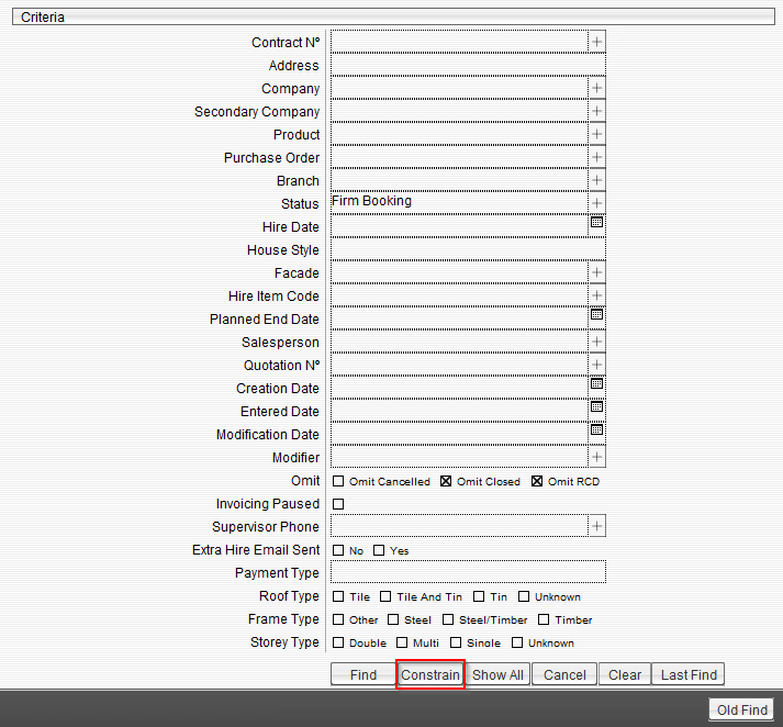 You can then constrain the results by then selecting the relevant fields (for our example we will select status to Firm Booking) and then selecting the Constrain button highlighted below.